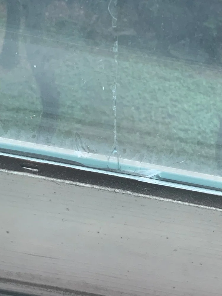 이중창의 바깥쪽 부분이며 실리콘 몰딩이 있는 가장자리 부분에 충격받은 흔적이 있고 그 부분부터 금이 이어져있습니다.