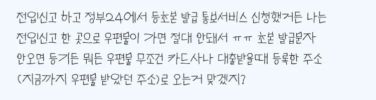 * 주소 변경 미신청 시: 별도로 카드사나 대출 기관에 주소 변경을 신청하지 않았다면, 기존에 우편물을 받던 주소로 계속 발송될 가능성이 매우 높습니다.