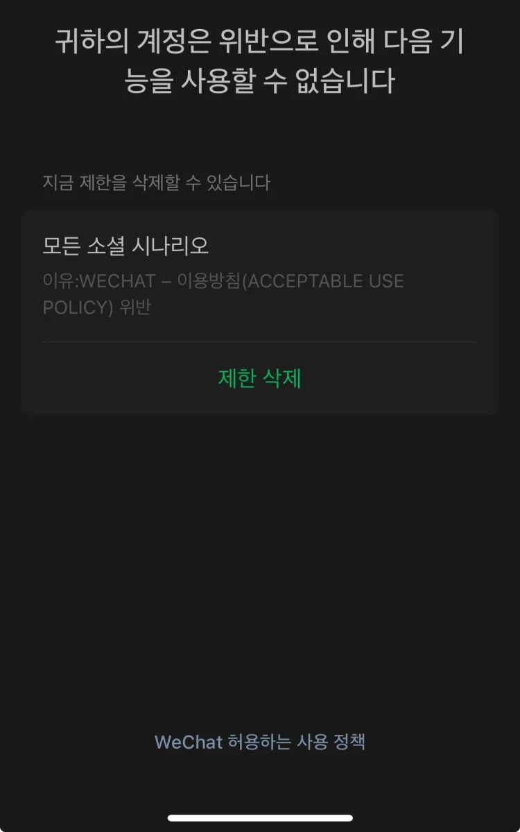 * 위챗 운영 정책 위반: 위챗은 사용자 간의 건전한 소통을 위해 다양한 운영 정책을 가지고 있습니다. 혐오 표현, 폭력적인 콘텐츠, 정치적인 메시지 등을 공유하거나, 과도한 광고, 도박, 성적인 콘텐츠 등을 유포하는 경우 계정이 정지될 수 있습니다.