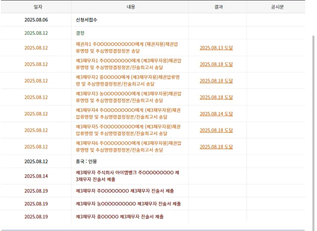 * 채권자: 압류를 신청한 곳입니다. 돈을 빌려줬거나, 받아야 할 돈이 있는 곳이겠죠.