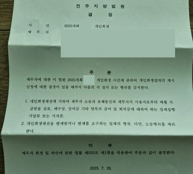 채무자가 개인회생을 신청했고, 변제를 요구하는 행위를 하면 안된다는 내용이었습니다.