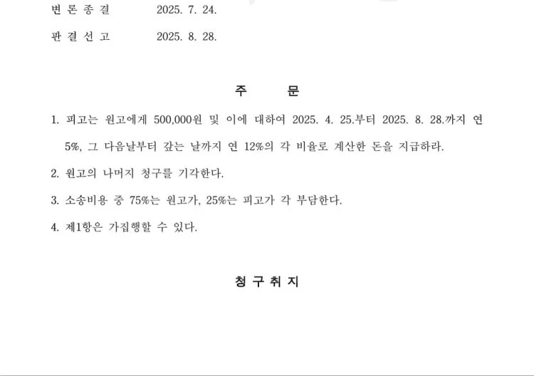 판결문에 적혀잇는 피고부담 소송비용 25%는 얼마인가요?