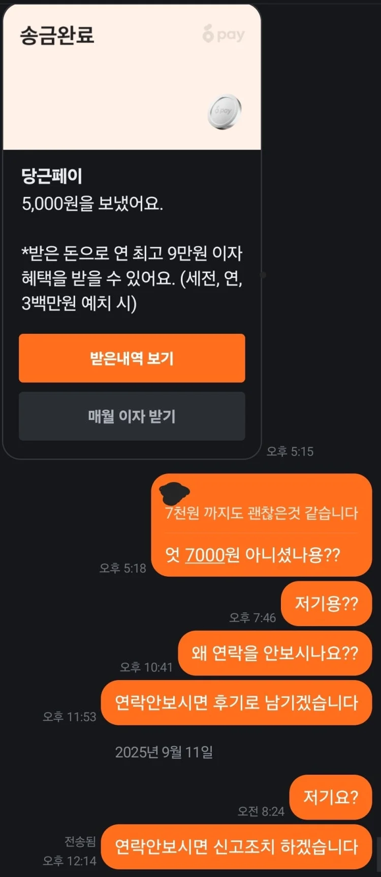 * 당근톡 대화 내용: 7000원에 거래하기로 합의한 내용, 구매자가 5000원만 입금한 후 연락을 받지 않는 내용 등.