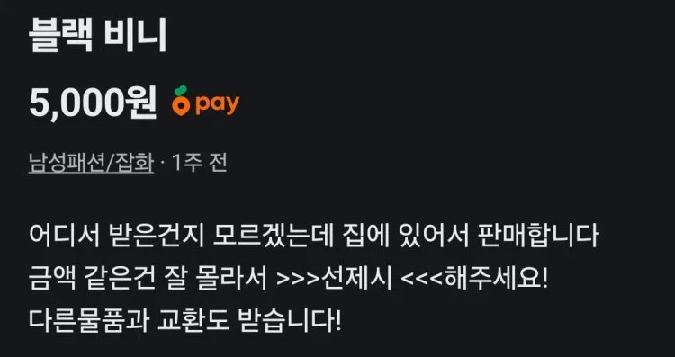 집에 비니가 있길래 비니를 판매하려고 금액을 5000원으로 써두고 선제시 부탁한다는 글을 올렸습니다 (첫번째 사진)