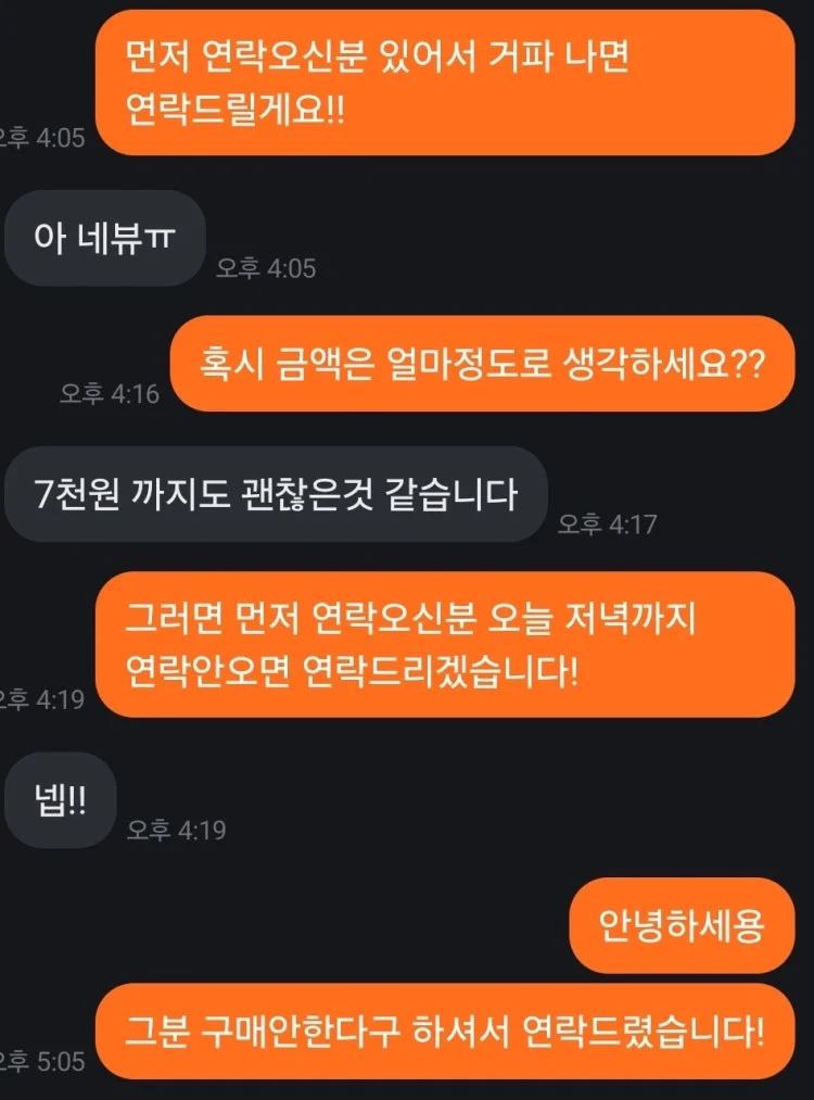 그리고 연락이 오셔서 거래를 진행하려 대화를 하고 7000원에 거래를 하기로 했습니다 (두번째 사진)