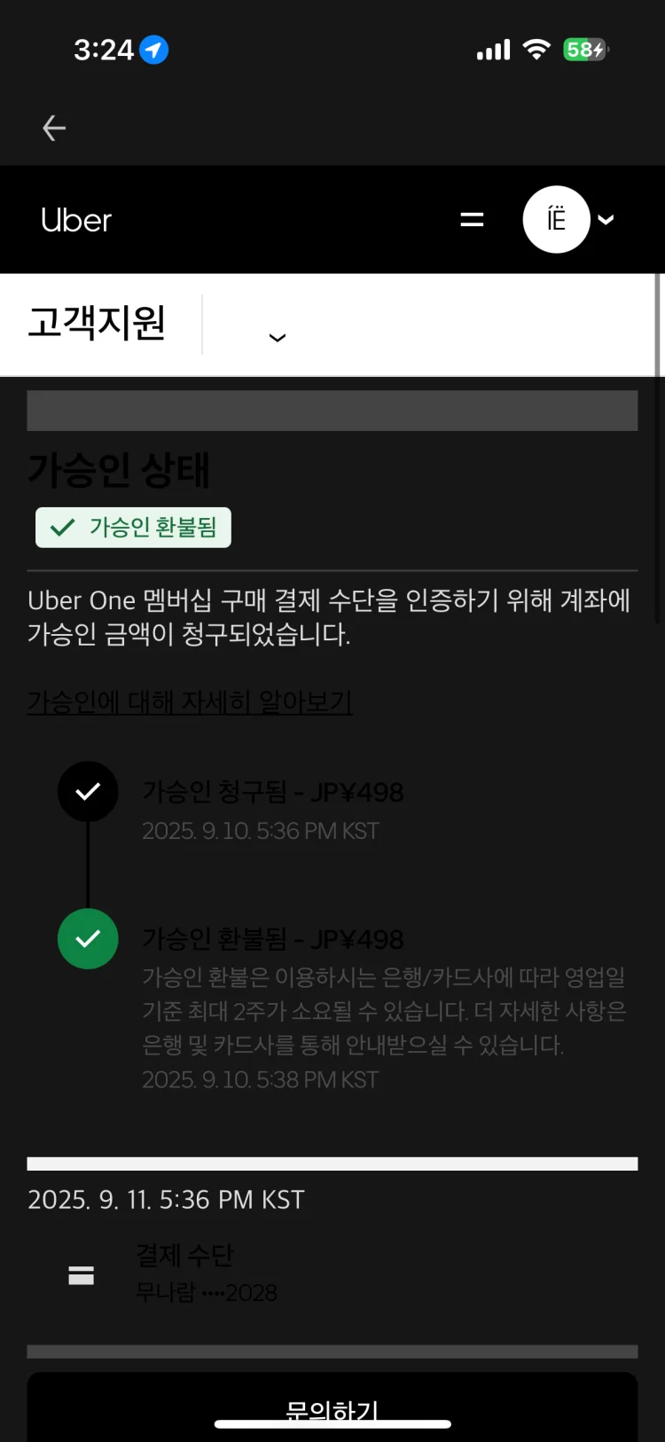 * 우선 카드사에 연락하여 해당 결제가 가승인인지 확인하고, 우버를 이용한 내역이 없음을 알리세요. 카드사에서는 가승인 상태를 확인하고, 환불 절차에 대해 안내해 줄 수 있습니다.