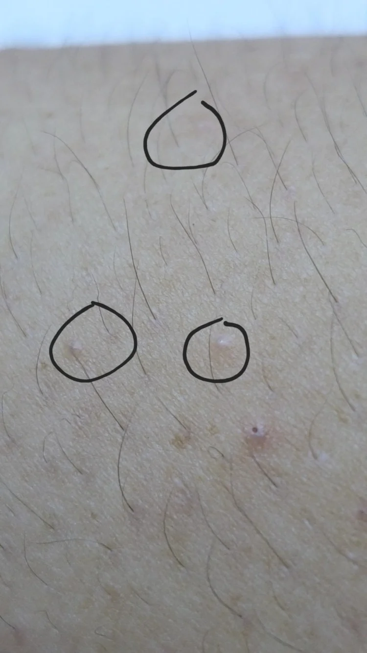 * 피지 낭종: 피지샘이 막혀 피지가 갇히면서 생기는 작은 낭종입니다. 모공각화증처럼 오돌토돌하게 보일 수 있지만, 짜면 덩어리진 피지가 나옵니다.