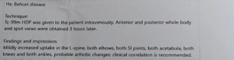 Dr.s Diagnosis안녕하세요. 올려주신 전신 뼈 스캔 결과에 대해 설명해 드리겠습니다. 하지만 제가 직접적으로 진단을 내리는 것은 아니며, 반드시 전문의와 상담하여 정확한 진단을 받으시길 권장합니다.